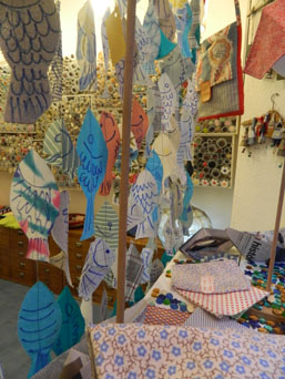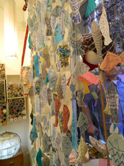 A partir de retalls de roba, hem fet uns patrons de cartó en forma de peixos. Posant-los sobre la roba i tallant-los han sortit aquests bonics peixets. Els hem cosit entre ells i els hem pintat, i ha sortit aquesta bonica cortina. També hem fet un mòbil a joc de la cortina. I tant serveix per nens com per posar-ho a finestra, com a la casa que tenim a la platge.