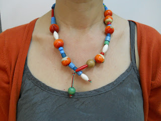 Tinc unes capses plenes de boletes de vidres de colors . Un altre capsa de boles de ceràmica fetes per mi de colors. Taronja i beig i taronja i vermell, de colors blaus , verds i morats. I les he posat a disposició per fer aquest taller de collarets. Uns tubets allargats fets de ceràmica de diferents colors han omplert un ampli ventalls de peces de ceràmica.